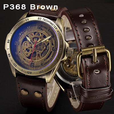 Automatic Watch Men Skeleton Mechanical Watch Steampunk Vintage Bronze Leather Transparent Watches montre homme Ship 24 hours